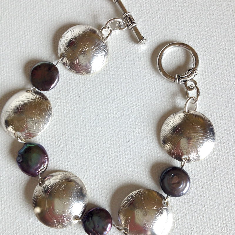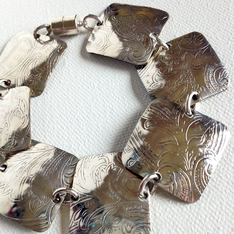 This collection is created from vintage (and often heavily tarnished) silver trays and platters.